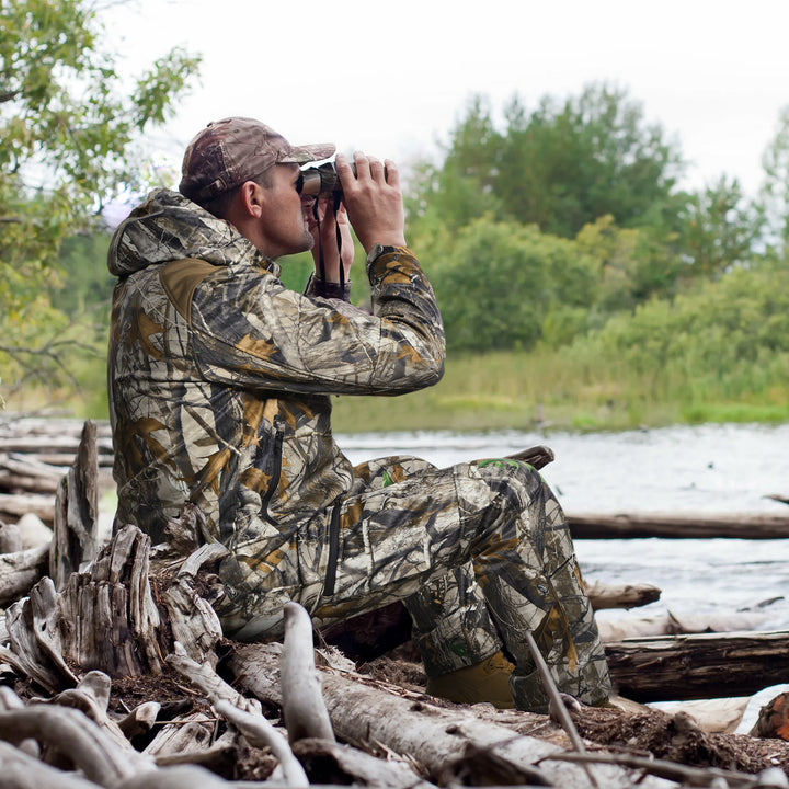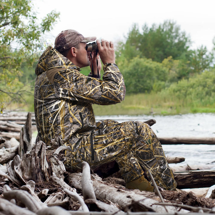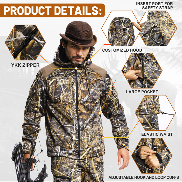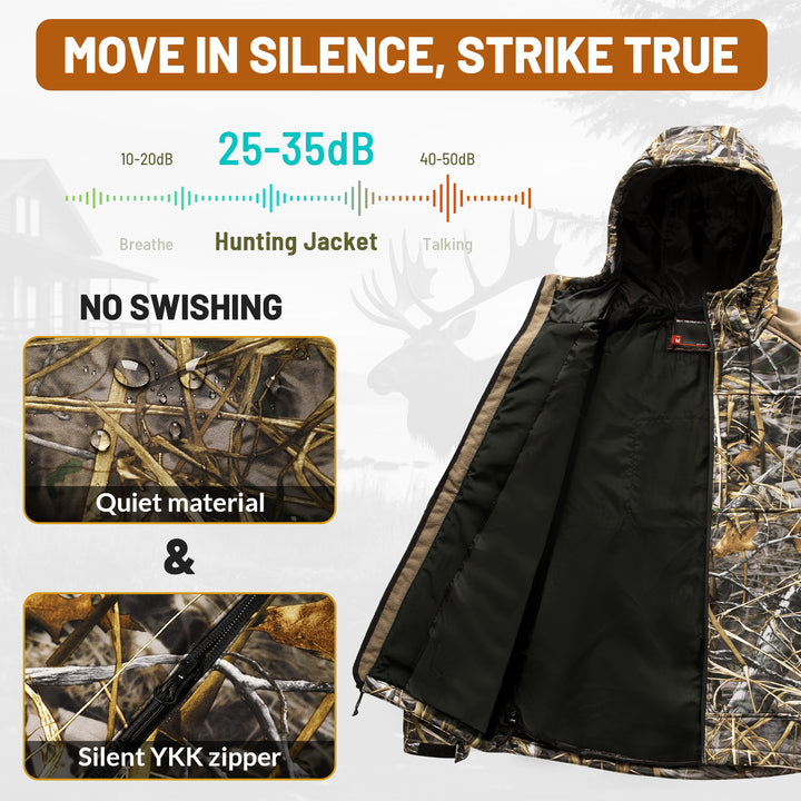 Weather-Resistant Hunting Jacket Design: Waterproof polyester shell with silent movement technology (<25dB). Includes 8 storage pockets, YKK zippers, and an Insert Port for Safety Strap. Adjustable hood and windproof construction block cold and severe weather.