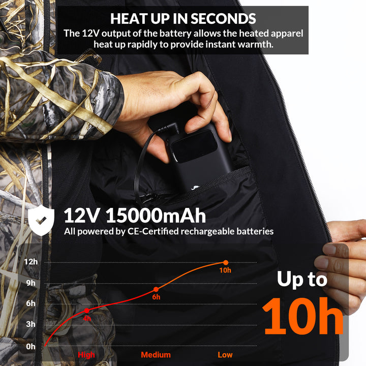 Long-Lasting 12V Battery with Smart Display:12V 15000mAh battery delivers 4-10 hours of heat. Features a digital LED power indicator and USB charging port for devices. Compact design fits in a jacket pocket while maintaining full mobility.