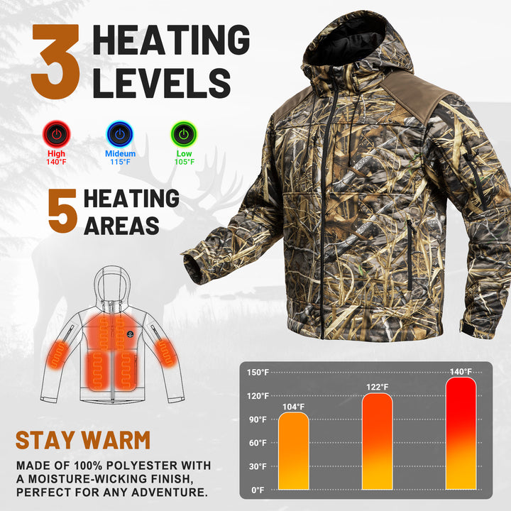 5 Core Heating Zones for Full-Body Warmth: This heated jacket features 5 carbon fiber heating zones (2 front, 3 back) that reach 65°C/149°F within seconds. Easily switch between three heating modes (low: 41°C/105°F, medium: 49°C/120°F, high: 65°C/149°F) via the discreet inner lapel control panel. Hidden indicator lights maintain stealth during hunting.
