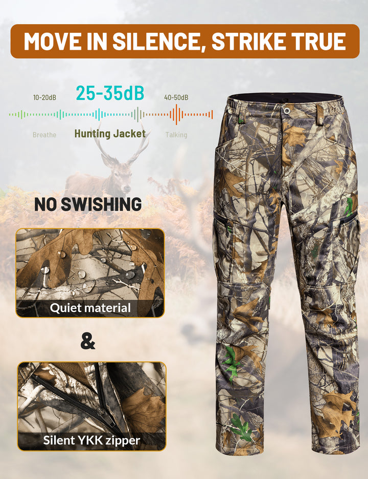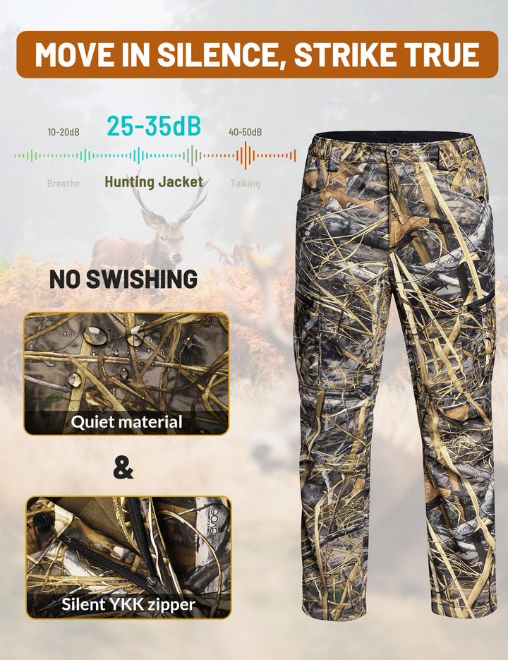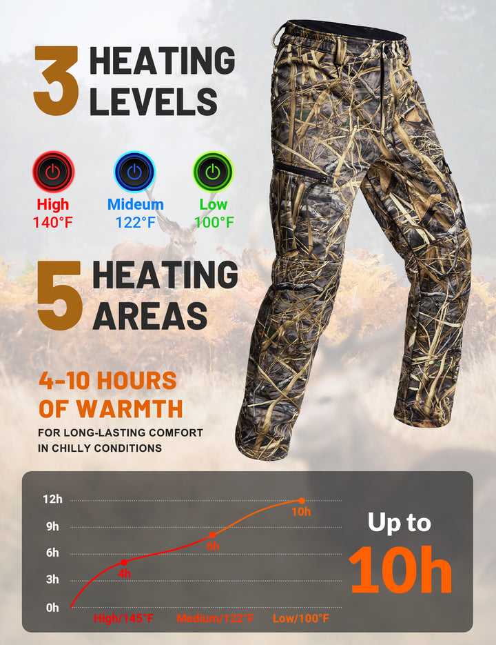 Silent Motion Technology & Versatile Design: Engineered for near-silent operation (<25dB), these Heated Hunting Pants eliminate fabric rustling, allowing you to move undetected. Perfect for hunting, camping, fishing, and outdoor work, they offer reliable warmth and comfort. With adjustable 3-level heating (Low: 100°F, Medium: 122°F, High: 145°F), you can tailor warmth to your activity and conditions, ensuring optimal comfort on every adventure.