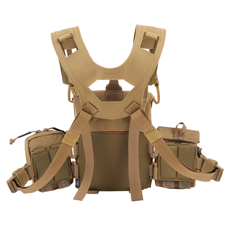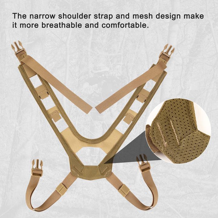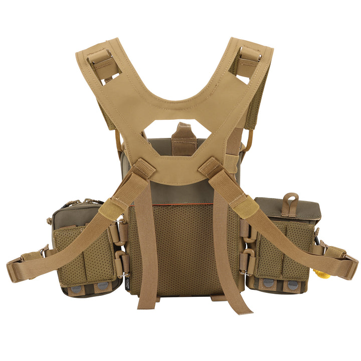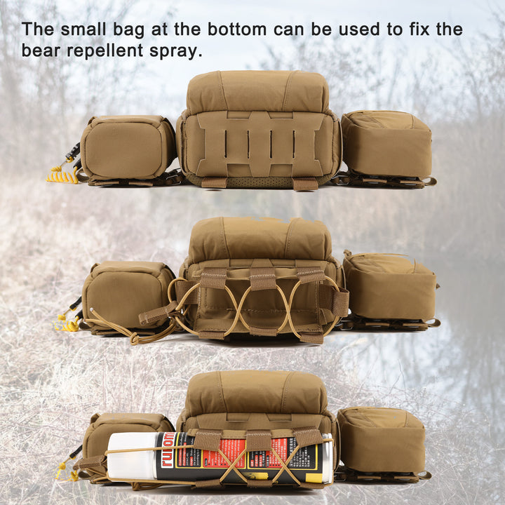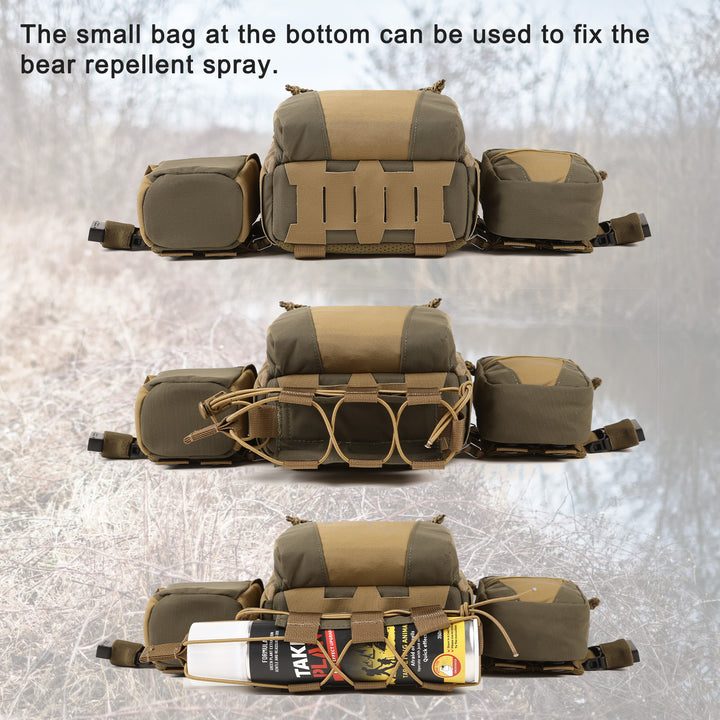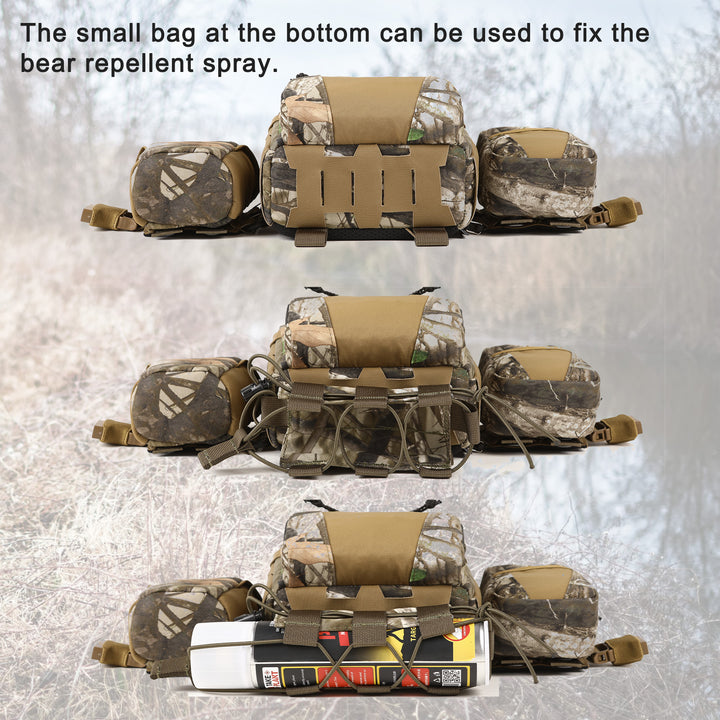 MULTI MOLLE SYSTEMS: There are MOLLE systems on both sides and the bottom of the bag, which are used to connect the rangefinder pouch, pouch for placing Bear Spray, etc., ensuring safety and stability. The shoulder straps are made of nylon and breathable mesh fabric. The front is water-repellent, wear-resistant, and anti-slip, while the back is breathable and comfortable. There is also a small pocket on the back of the case for thinner items. The part that touches the chest is made of breathable mesh fabric, which is skin-friendly and comfortable.