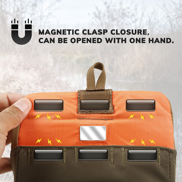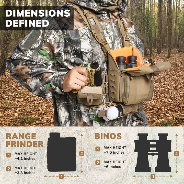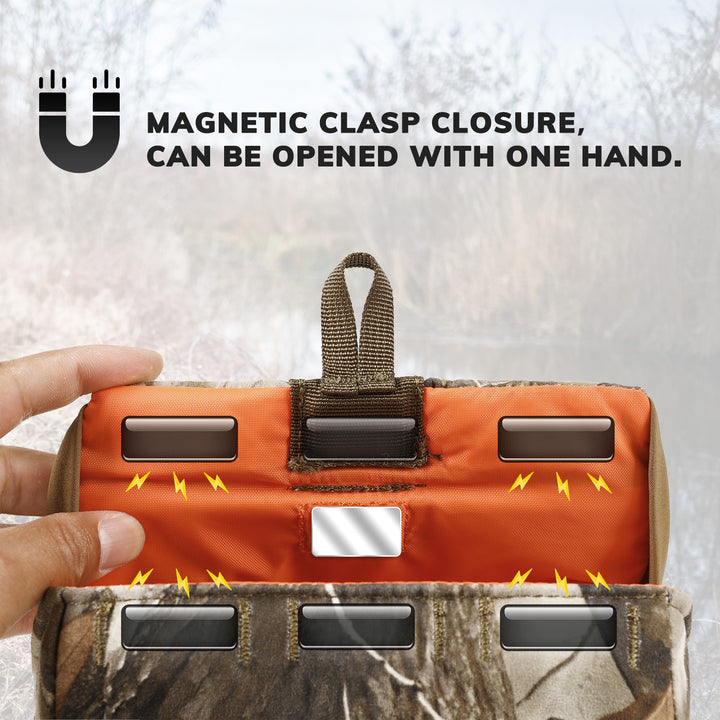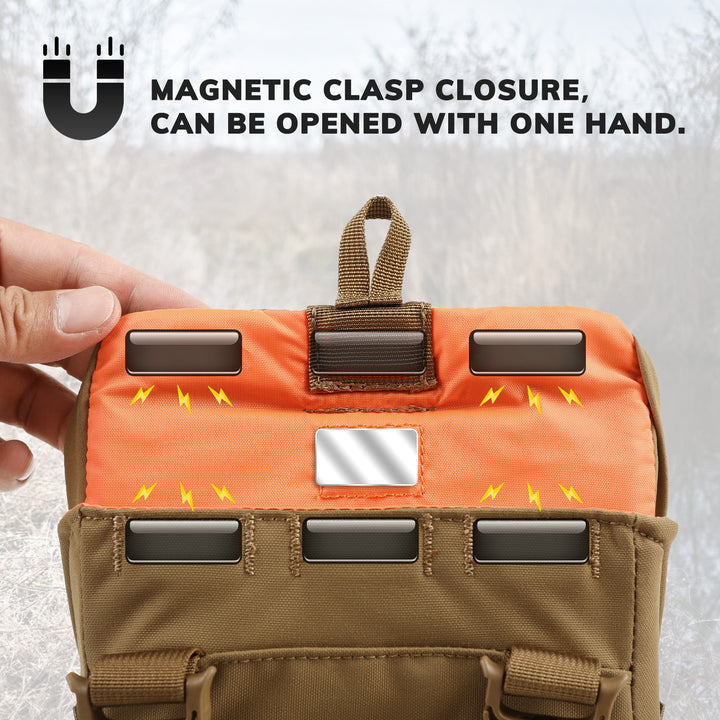 SILENT DESIGN: Magnetic clasp closure instead of zipper closure, can be opened with one hand, allowing for quicker and quieter access to the binocular, making the hunting process quieter. Although it is convenient to take out, it closes very tightly. Additionally, it is equipped with binocular safety belts to prevent the binoculars from falling. The front small pouch has a zoned design inside, allowing for the classification and placement of small items, making it convenient to take them out.