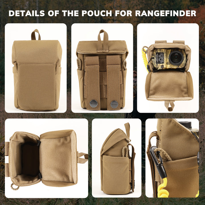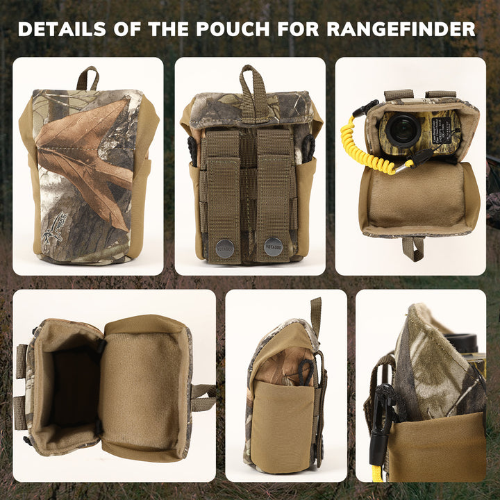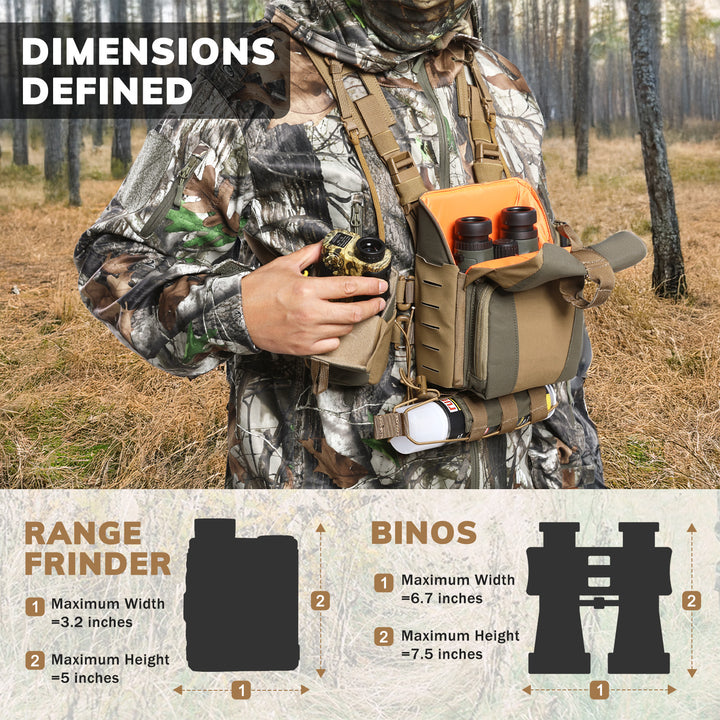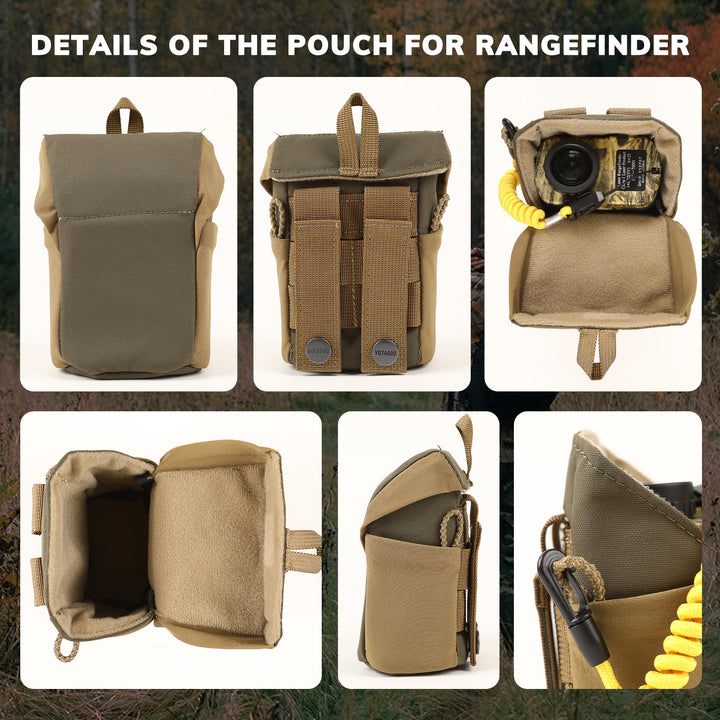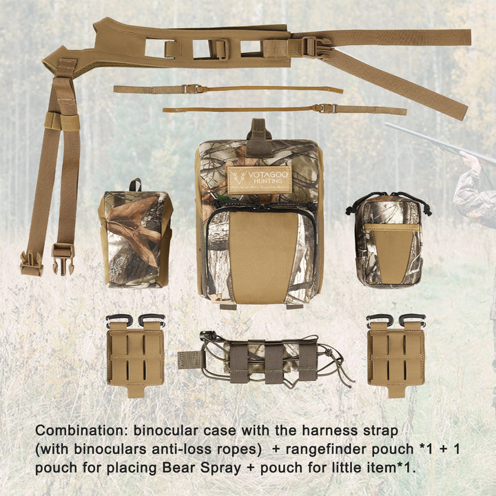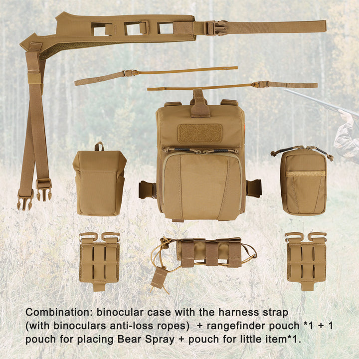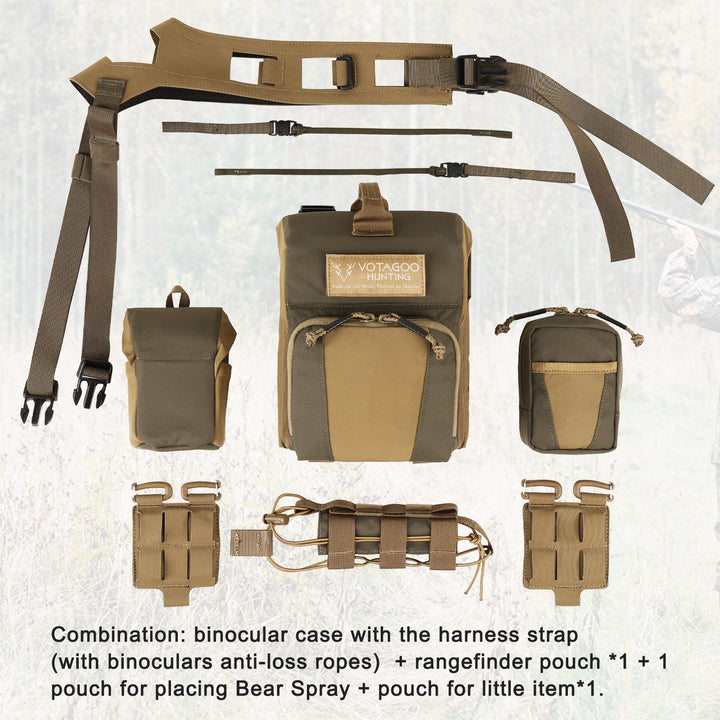 STYLE: There are two styles to choose from: (1)single binocular case with the harness strap. (2)binocular case with the harness strap + rangefinder pouch *1 + 1 pouch for placing Bear Spray + pouch for little item*1. The inner lining of the rangefinder pouch is made of soft flannel to reduce friction and better protect the lens. The rangefinder pouch also adopts a magnetic buckle closure method, which is convenient to take out and silent.