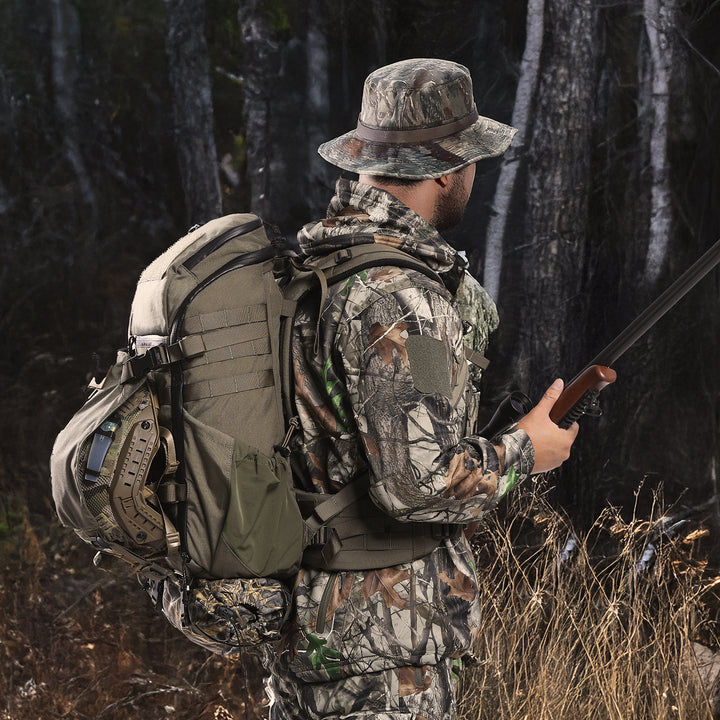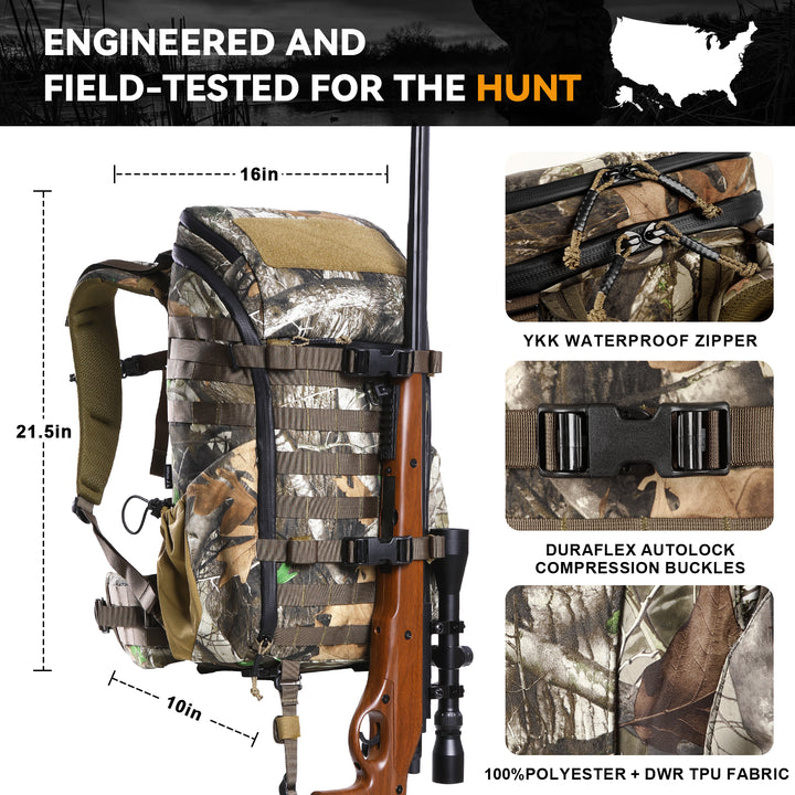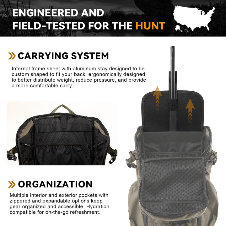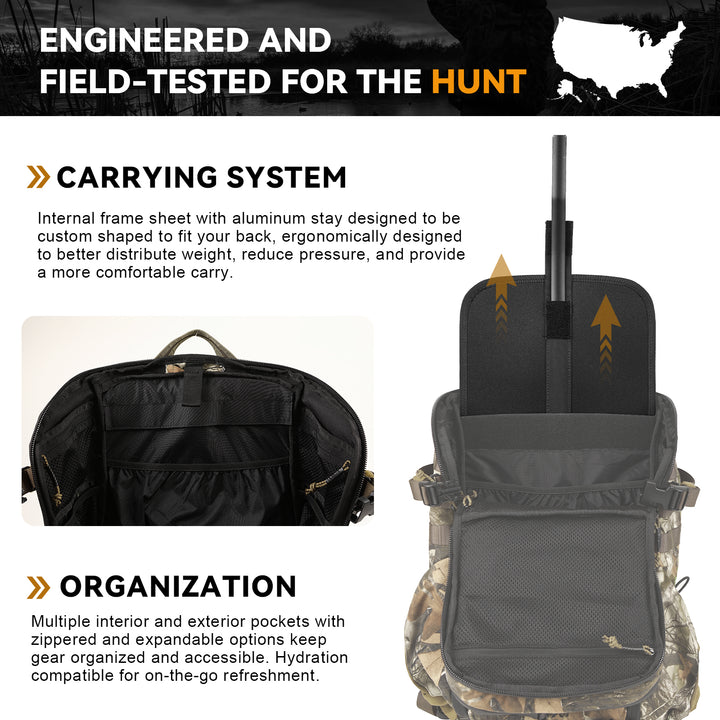 Capacity Hunting Backpack: This hunting backpack offers a roomy 2000 cubic inch main compartment, perfect for carrying food, clothing, and essential hunting gear for a full day in the field. Multiple interior and exterior zippered pockets, plus a lid pocket, keep everything organized. Full clamshell YKK zippers and a horseshoe opening ensure complete, hassle-free access when seconds count.