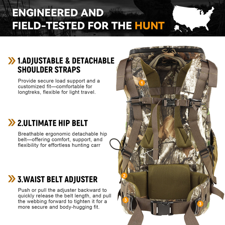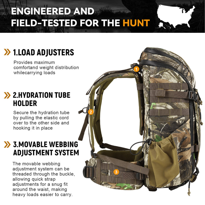 Comfortable Ergonomic Carry System: Designed with an internal frame sheet and aluminum stay, this hunting bag can be custom-shaped to fit your back. The ergonomic suspension system distributes weight evenly, reducing pressure and improving comfort. Padded, adjustable shoulder straps and a movable waist belt adjustment system keep the hunting backpack stable, making heavy carries easier on long treks.