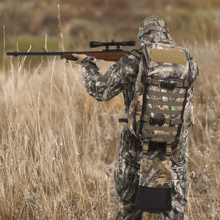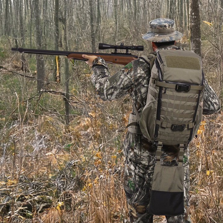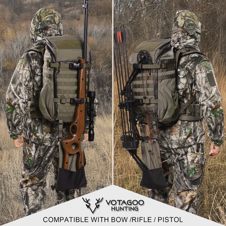 Versatile Carry System: This saddle hunting backpack adapts to any setup: the front compression system and removable rifle holder secure a bow or rifle, while external MOLLE webbing supports modular gear attachments. Dual stretch-woven side pockets hold water bottles or trekking poles, and compression straps with locking hooks keep loads tight and steady.