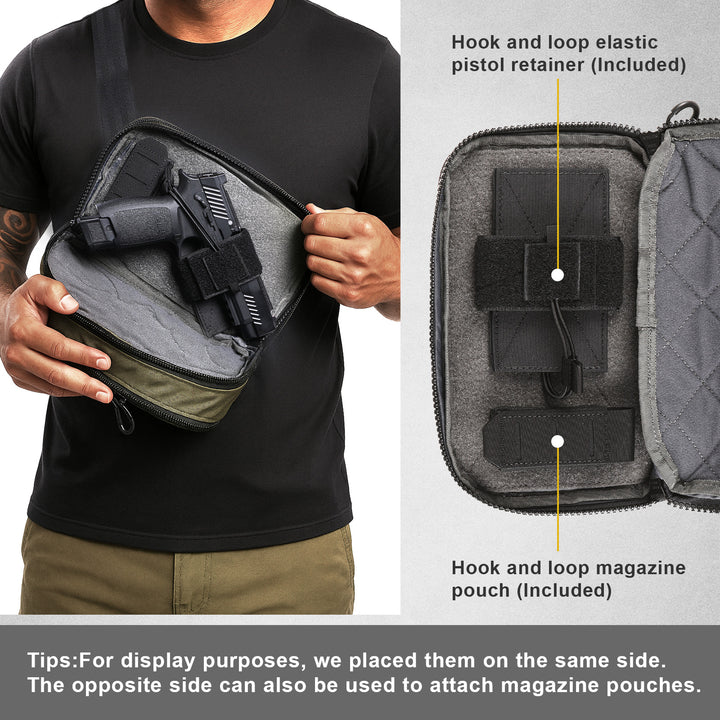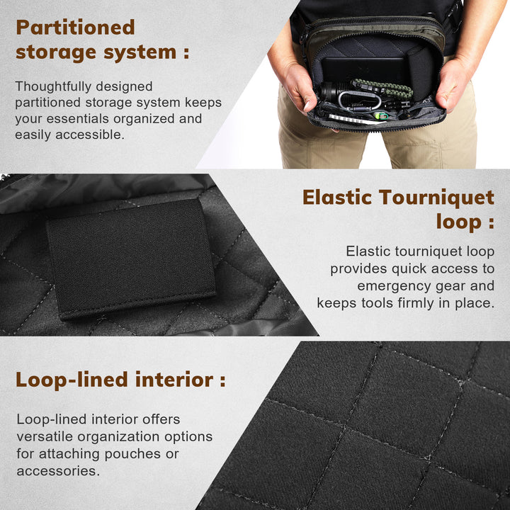 Secure, Fast Access — Hook-and-loop pistol retention panel, tourniquet elastic loop, and webbing lanyard points provide secure retention with quick, tactile access.
